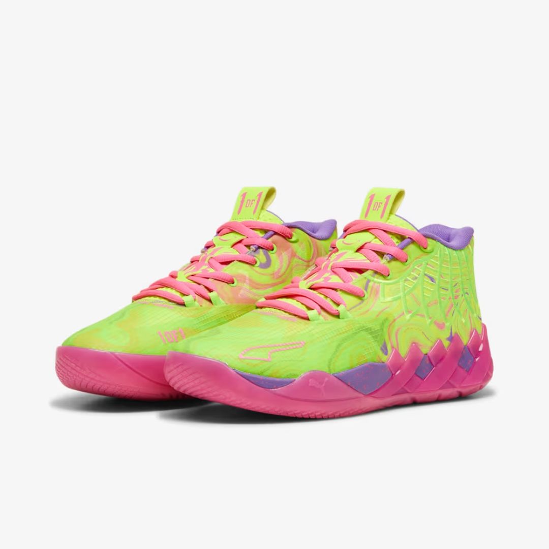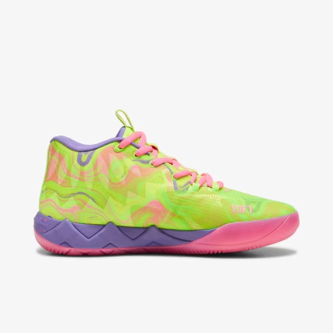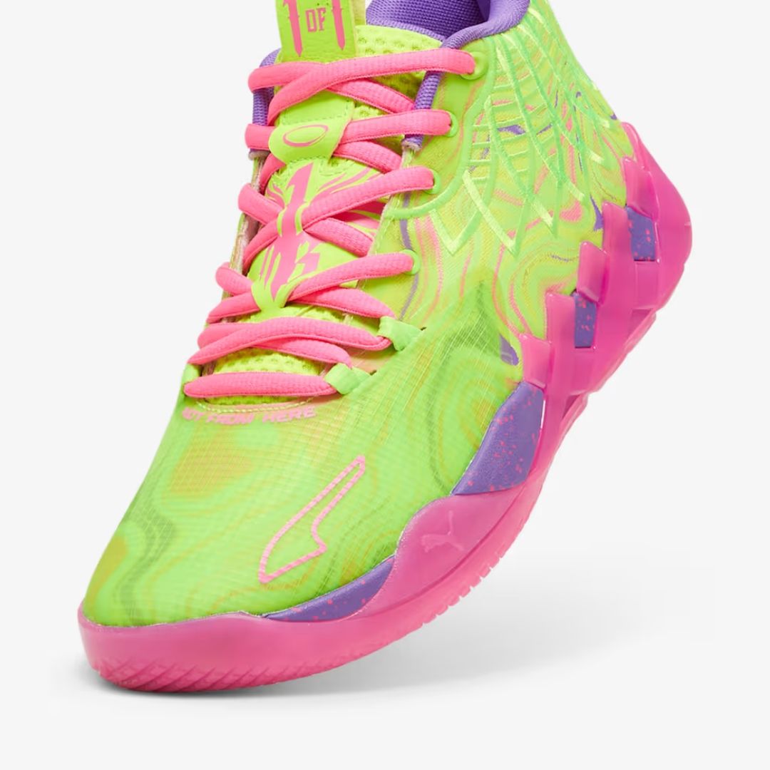 LaMelo Ball's first signature shoe MB.01 features MELO-branded "Not From Here" accents like his signature wings and "1 of 1" motto. The galactic sole and space-age PUMA HOOPS technology, including NITRO™ foam, make tournament ready look interplanetary. The upper of this shoe features rocket ship flames shooting out of the collar, a reference to Melo's spaceship tattoo on his leg.