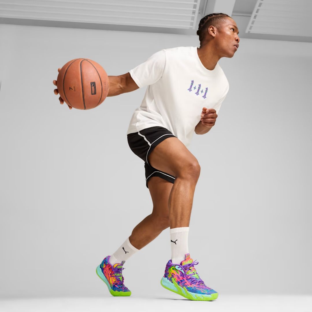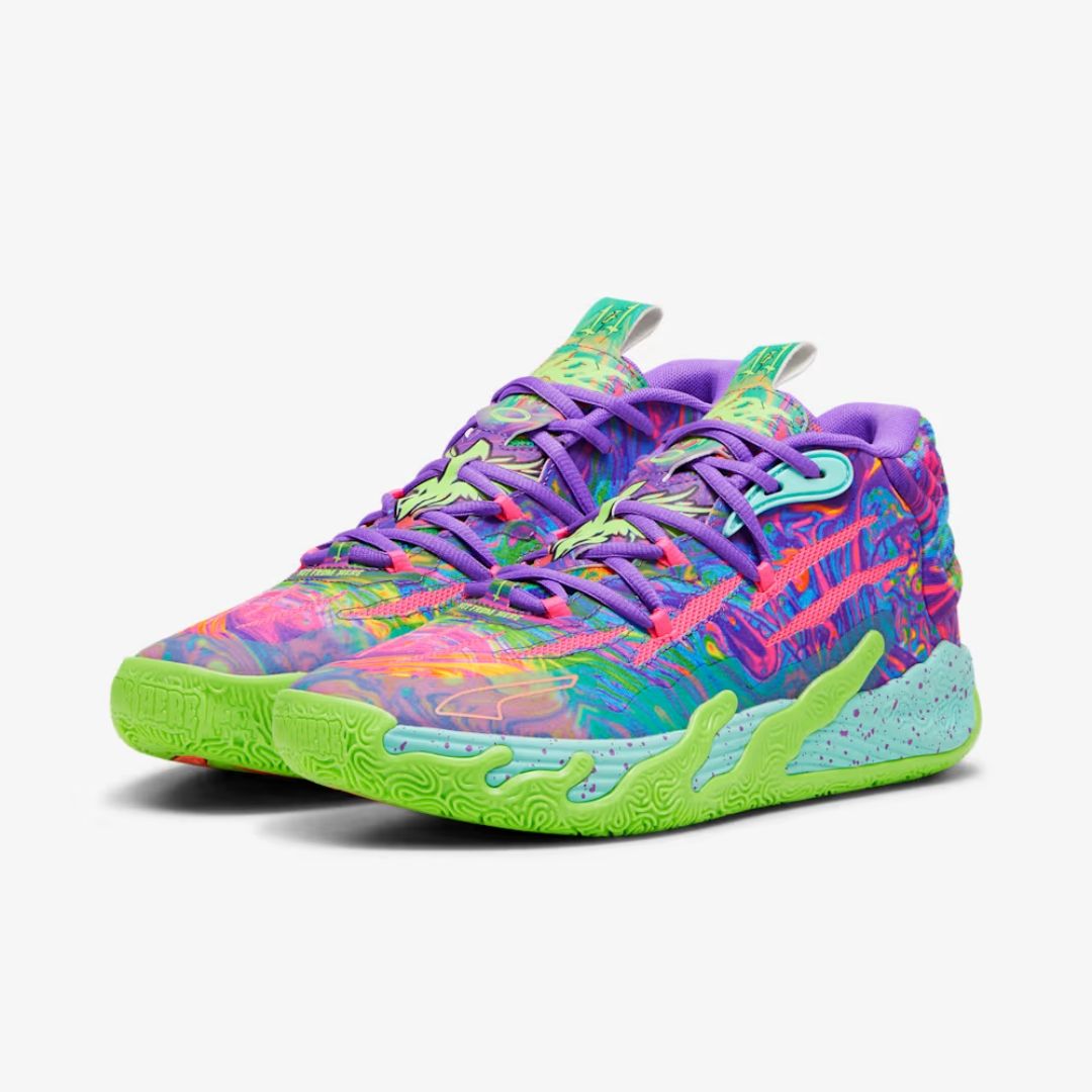 LaMelo Ball’s third signature shoe MB.03 takes a trip to the never before seen alternative universe that is the Melo world. Highlighted by slime inspired rubber wrap-ups and an engineered knit upper with scratch cutouts, the MB3 is truly Not From Here. The slime sole and space-age PUMA Hoops tech make tournament ready look interplanetary.