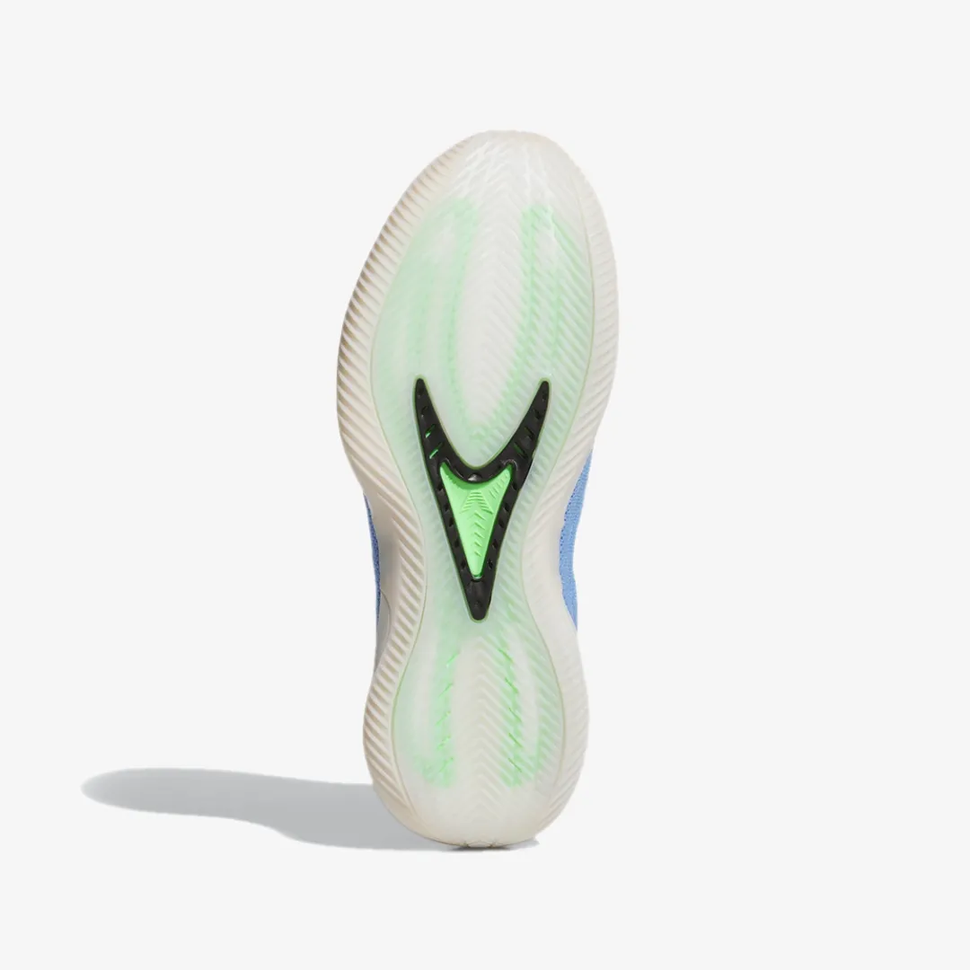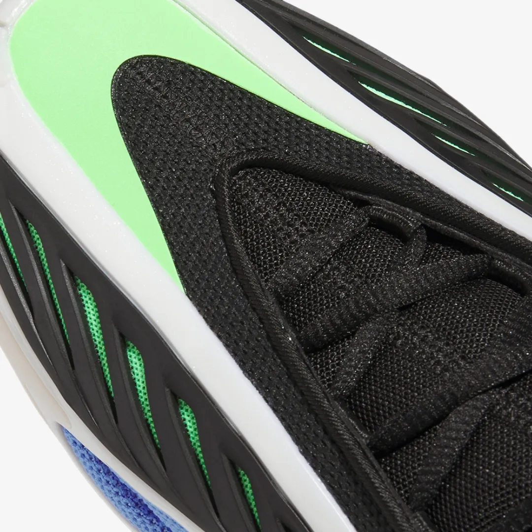 The adidas AE 2 'Blue Fusion' features a breathable black mesh upper with vibrant blue mesh side panels. Black TPU overlays reinforce the heel and forefoot, the latter featuring cut-out detailing that reveals a neon green mesh underlay. Anthony Edwards' personal logo adorns the tongue. His second signature shoe rests on a midsole that combines Lightstrike with Light Boost cushioning. A built-in propulsion plate offers improved energy return and torsional rigidity, while a modified herringbone outsole provides optimal grip.